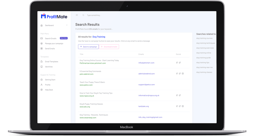Profit Mate will scan the internet and find all website owner's with "Dog Training" affiliated sites.